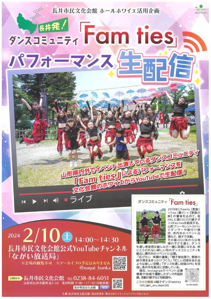 山形県内外でイベント出演しているダンスコミュニティ「Fam ties」によるパフォーマンスを長井市民文化会館からYouTubeで生配信します。長井市民文化会館公式YouTubeチャンネル「ながい放送局」より、ぜひご覧ください。<配信日時>令和6年2月10日(土)14:00〜14:30※会場内観覧不可※アーカイブの予定はありません。配信はコチラからhttps://www.youtube.com/channel/UCw3AZ0GpxejgwycNemOU_aw<お問い合わせ>長井市民文化会館 0238−84−6051詳細はコチラ