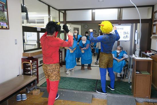 今日は節分の行事でした。年男年女の皆さんが、赤鬼と青鬼に向かって元気に豆まきをし、他の利用者の皆さんも大きな赤鬼と青鬼のボードに向かって紙ボールを投げました。昼食は手作りの太巻きとおいなりの献立で、午後からは鬼とお多福のおまんじゅうでお茶会をして、今年一年の無病息災を祈りました。