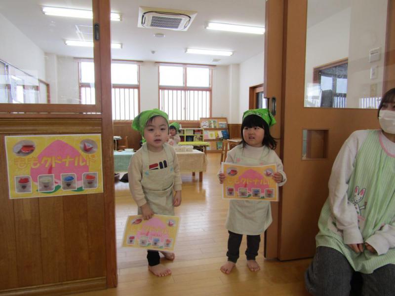 今日は子どもたちが楽しみにしていた「にこにこの日」でした。幼児組さんはグループ毎にどんなことをしたいか、どんなふうにすればみんなが“にこにこ”になるかを考え、ぐーグループは「サーティワン」、ちょきグループは「ちょきマルシェ」、ぱーグループは「おみくじやさん」に決定!もも組さんは子どもたちと話しをする中で出た「マック屋さん」を出店することなりました。役割や内容を考え、作り物をしていよいよ当日!幼児組・もも組さんだけではなく、うめ・さくら組さんも各コーナーを回り、お兄さんお姉さんとやりとりをしながら楽しみました。「100円になります!ありがとうございました!」と品物を渡してもらうと素敵な笑顔が!みんなの笑顔があふれる「にこにこの日」となりました。