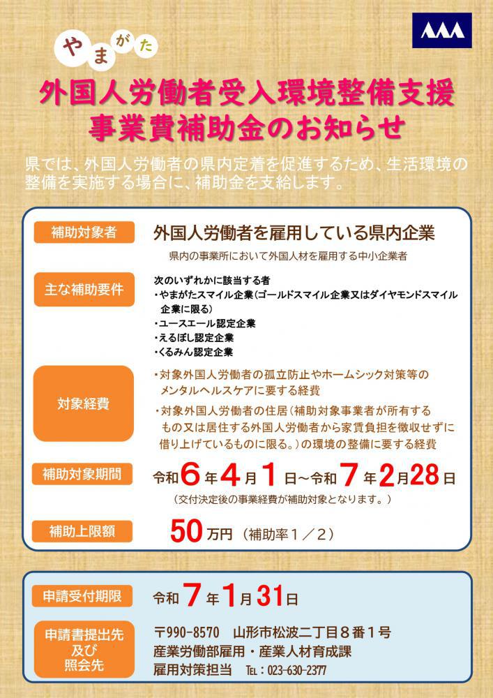 ●【補助金】令和6年度山形県外国人労働者受入環境整備支援事業費補助金について