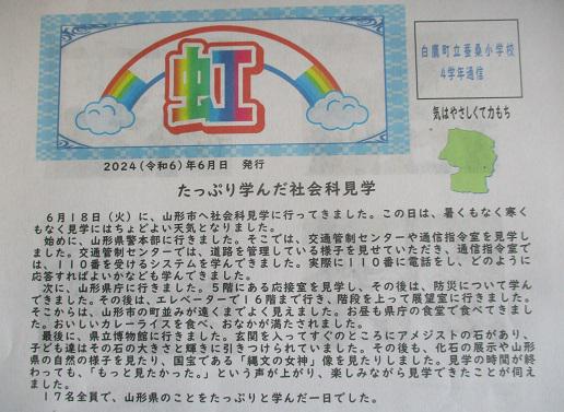 上記の通り、4年生は山形県の中心山形市へ。まずは、県警本部へ・・・。交通管理センターでは、山形市の交通状況が一重でわかります。 いろいろと説明をお聞きしながら進みます。道路管理の様子や110番を受けとるステムについて学びました。 次は山形県庁。のぼり旗もよく目にするものです。 あ、山形県のシンボルマーク! 防災について、しっかり学びました。 そして展望室へ。16階から見た山形市。 県庁の食堂で。私も1度は行ってみたい! おいしそ〜! はい、ここはダイカイギュウや縄文の女神がいる県立博物館。 うぉ〜っ! もっと見たかった!今度はおうちの方とね。 山形見学の時間が名残惜しいバスの中。 山形漬けの1日に、満足!の4年生。山形県人であることを誇りに思ってくれると嬉しいな。