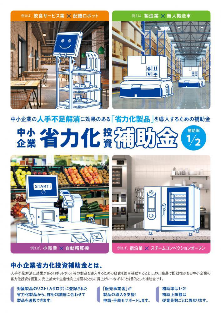 中小企業のみなさまへ、省力化への一歩を支援します。IoTやロボットなどの付加価値額向上や生産性向上に効果的な汎用製品を「製品カタログ」から選択・導入することで、中小企業等の付加価値や生産性の向上、さらには賃上げにつなげることを目的とした補助金です。ぜひご活用ください。 ※申請はgBizID(アカウント)の取得が必要です。取得には一定期間を要しますので、申請を検討される方はお早めにお手続きください。 申請期間、公募要領等はHP(中小企業省力化投資補助金 (smrj.go.jp))をご覧下さい。