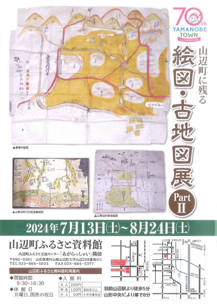 ふるさと資料館にて、町内に残された江戸時代から明治時代までの貴重な地図を展示いたします。【日時】令和6年7月13日(土曜日)〜8月24日(土曜日)午前9時30分〜午後4時30分【場所】山辺町ふるさと資料館住所:山辺町大字山辺208−1【入場料】・大人 200円・学生 100円(高校生以上)・小人 50円(小中児童生徒)【休館日】毎週月曜日、国民の祝日【お問合せ】山辺町ふるさと資料館電話:023−664−5033