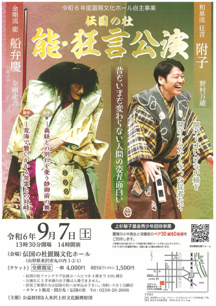 伝国の杜置賜文化ホールにて、「能・狂言公演」が開催されます。野村万蔵が、「和泉流狂言 附子」を、金剛龍謹が、「金剛流 能 船弁慶」を披露します。ぜひ、ご来場ください。<日時>令和6年9月7日(土) 開場13:30 開演:14:00<場所>伝国の杜置賜文化ホール<料金>全席指定一般 4,000円高校生以下(5才以上)1,500円<問い合わせ>伝国の杜 0238-26-2666詳細は、チラシをご覧ください。