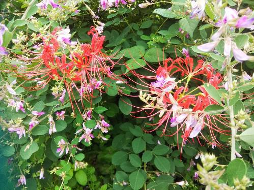 我が家の曼殊沙華が咲きました、萩の花が広がってきてその中に紛れるように咲くことになりました、我が家のは毎年10月に入ってから咲いたりするのですが、今年は早いですというか、この時期が本当ですね、彼岸花の別名「曼珠沙華(まんじゅしゃげ)」は、サンスクリット語で天界に咲く花という意味。お彼岸に咲き、土葬をモグラや野ネズミなどから守るため、墓地などによく植えられていることから、「死人花(しびとばな)」「幽霊花(ゆうれいばな)」「地獄花(じごくばな)」のようなちょっと怖い呼び名もついている