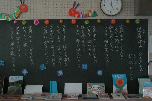 1・2年生の図書室で、しっかりこぐわっ子たちに語りかけてくれる詩。図書ボランティアのSさんが書いてくださいました。 今度は、1・2年教室で、語りかけてくるメッセージ。授業と連動しています。 朝、学校に来て、なんとな〜くぽ〇も〇の話をしながら自分たちの花壇の草むしり。 「先生、おばあちゃんがみんなに見せて!と持たせてくれました。」「みんな〜、ちょっとお手伝いして〜!」「ぱちり!」 からすうり、あけびの目玉つき・・・見たこともない植物に、ますます豊かになる1年生!ありがとうございます、Kさん!月に1度の仲良し遊び。みんな、拍手をしているのは・・・新しい班なので、自己紹介。いいねえ!「うぉりゃ〜!始めるぜ!」うふふ・・ こんなにたくさんの人数で鬼ごっこ!つかまるかな〜・・・。 なんだこりゃ?3年生が、太陽の位置と影の学習をしているとか。ダブルAさんが、方法を考えだしたとか!晴れた日にしかできないね!(給食中も、代表の人たちが記入をしていきました!) 体育館でも鬼ごっこ!6年生は本気になると、低学年がつかまえられないので、ちょっとお遊びしながら…。 あら、やさしいねえ! おっと、本気になりましたか! そしてグラウンド・・・、なんと、みんなつかまって鬼だらけ!今日も晴れたぞ、気持ちがいいわい!のこぐわっ子たちでした!