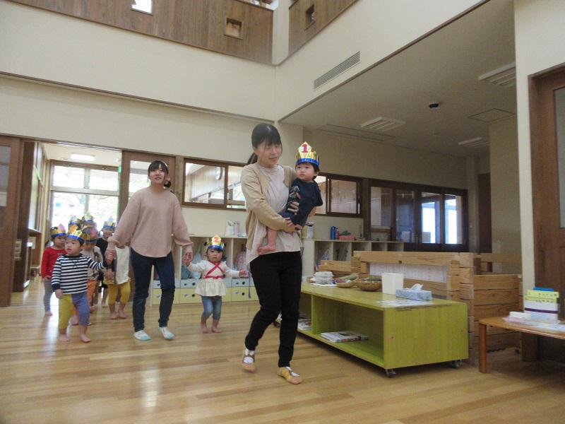 10月17日(木)に10月の誕生会がありました。今月の誕生児は10名。登場してから、大勢の人を目の前にドキドキの子どもたち。司会のゆり組のお友だちもドキドキだったようです。1人1人、得意なことを披露し、拍手をもらうと恥ずかしそうにしながらも嬉しそうな表情が沢山見られました。お楽しみは「さるかに合戦」のペープサートでした。手作りハロウィンケーキにのっているおばけのクッキーに「かわいい?」と喜ぶ子どもたちでした。