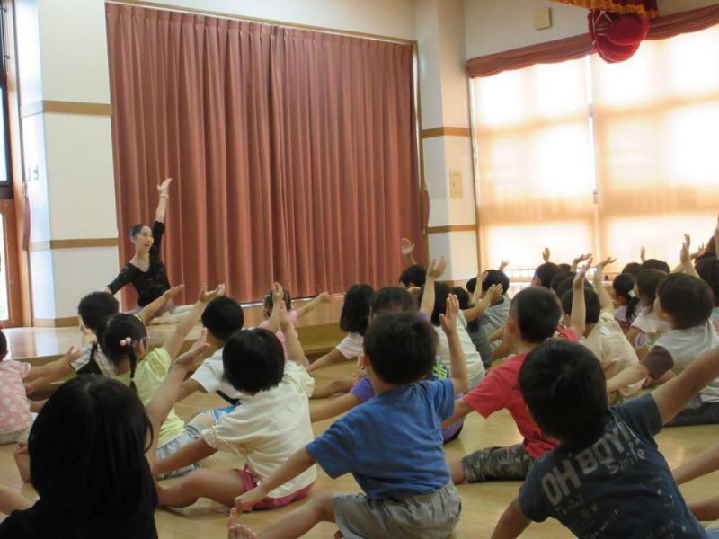 9月9日クラシックバレエの方が来園し、子ども達にバレエの基本ストレッチを教えてくれました。バレエストレッチを見て子どもたちも真剣に真似て体を動かしていました。最後は素敵な衣装を着て音楽に合わせた踊りを見てみんなうっとりしていました。