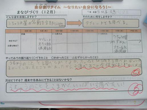 今日は、12月の「まなびづくり」のまとめの日。宇宙に興味を持ったり ご当地キャラ、魚に興味を持って調べたり、ひたすら1・2学期の復習をしたこぐわっ子たちなど、それぞれの収穫がありました。 こちらは1年生。「下から2番目、左から3番目の道具は何でしょう」の問いに、・・・ 5人、6人…トライしましたが、なかなか答えられません。「むずかし〜!」言葉の持つ意味を理解するのは、難しいことなのですね。「下から2番目はこの列、左から3遍目はこの列、だからここだよ!」「あ〜!そっか!」「1学期やったのにな〜‘。次もわからないときは、みんな冬休みないかもね〜。」「え〜っ!」次は、解けたのでしょうか。かしこくなるのは、むずかしいですね。「今日は、階段凍っているところがあるから注意して!」の言葉に、さっそく氷を溶かしてくれている6年生。さすがです。 これまた凍るような廊下で、しっかり掃き掃除をしているエコボランティア委員。ありがとう!みんな、気持ちよく過ごせます。 3・4年体育、なんとすごい! 果敢に技に挑戦しています。いいぞ! 先日、白鷹町スポーツ協会表彰で、奨励賞をもらったこぐわっ子たちです。 自分の得意なことがあると、自信も出てきます。校長室を出るときも、アスリートらしい姿で、きちっと礼もできて、気持ちが良かった! 登校して約3時間ですが、一気に「かしこく・易しく・たくましく」の姿を見ることができました。 今、4年生のお楽しみ会の声が聞こえます。またいい顔が見られるかな!