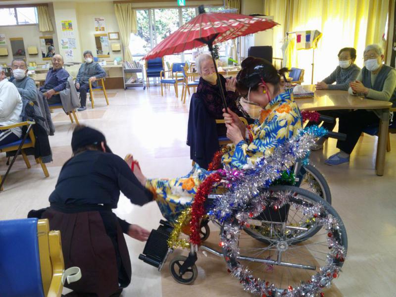 12/18〜20日の三日間、忘年会を行いました。今回は、三日間内容を少しづつ変えながら、皆さまに楽しんで頂ける様にしました。18・19日は、ビンゴ大会を行い、上位3名の方へ景品をプレゼント。18日はゲストを1名お招きし、ステージショーを開催。19日には更にプラス1名ゲストをお招きし、2名の歌手によるステージショーを開催。最終日の20日には、カラオケ大会を開催しました。今回は利用者様だけでなく、職員も数名歌を披露。利用者様とデュエットも行いましたよ。最後に、利用者様一人一人に職員手作りの写真入り色紙をプレゼント!!皆さん喜んで下さっていました。