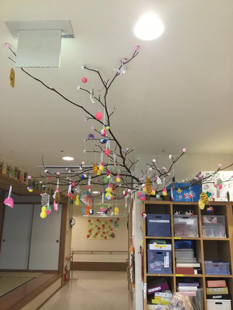 新年あけましておめでとうございます。今年もよろしくお願いします。今年最初は、恒例の団子木飾りを行いました。ふなせんべいやお団子など、皆さんに飾りつけして頂きましたよ。とてもカラフルな可愛らしい団子木が今年も出来上がりました。今年は、去年に比べ雪も多く、インフルエンザも流行しているようです。手洗い・うがい・換気などの声がけ継続し、1年間元気に楽しく過ごしていただけるよう職員一同頑張っていきますのでよろしくお願いします。