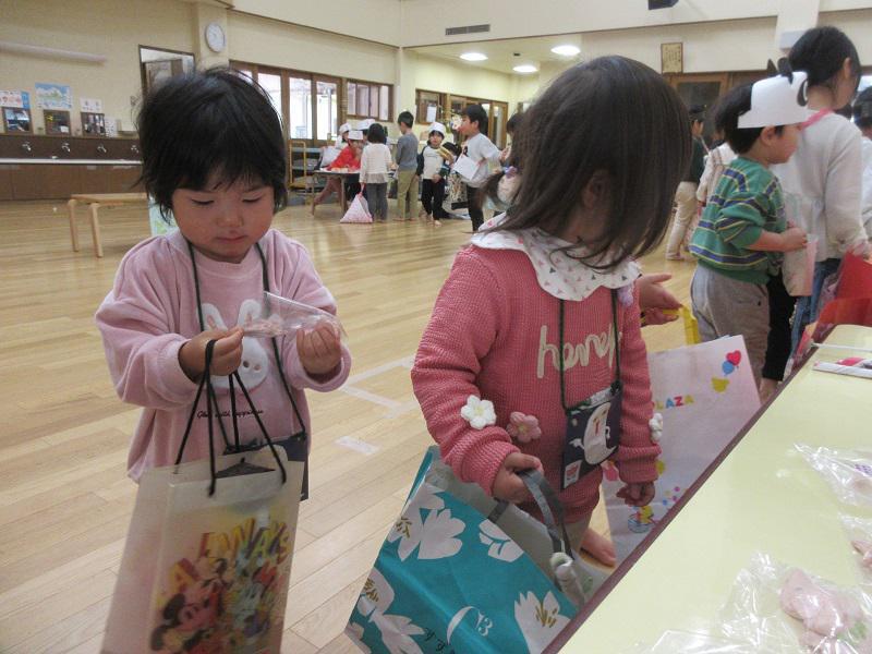 1月22日(水)はおたのしみ会1日目でお店屋さんをしました。それぞれチームで話し合い出店を決めました。まっしゅるチームは的当てゲーム、すみっこぽけもんチームはかっぱ寿司、おさかなパワーチームはおさかなまっくぱわー、おはなどらごんチームはお化け屋敷、もも組はドーナツやさん、うめ組はおかしやさんと、様々なお店がありました。店員になった子ども達は「いらっしゃいませ」と大きな声で呼びかけをし、「どれがいいですか?」となりきりながら楽しむ姿がありました。買い物は、友達や異年齢チームでお店を回り、「マック行こう!」「お化け屋敷楽しかった」など笑顔がたくさん溢れていました。乳児組は少し緊張している姿がありましたが、お金を渡して好きな商品を選び楽しんでいました。