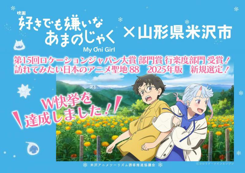 アニメ映画「好きでも嫌いなあまのじゃく」×米沢市が「第15回ロケーションジャパン大賞 部門賞 行楽度部門 受賞」「訪れてみたい日本のアニメ聖地88 2025年版 新規選定」のW快挙を達成!山形県が舞台の2024年5月24日(金)よりNetflix世界独占配信中の長編アニメーション映画「好きでも嫌いなあまのじゃく」が、みなさまの応援のおかげで「第15回ロケーションジャパン大賞 部門賞 行楽度部門 受賞」+「訪れてみたい日本のアニメ聖地 88 2025年版 新規選定」のW快挙を達成することができました!みなさま、ありがとうございました!引き続き、応援よろしくお願いします!【写真提供:ロケーションジャパン】