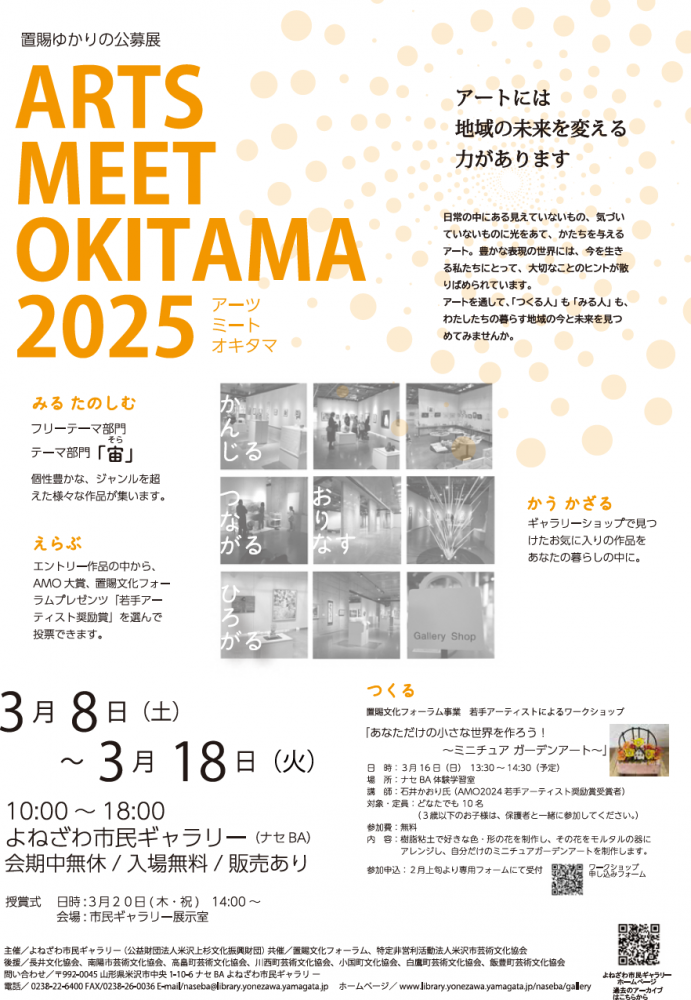 よねざわ市民ギャラリー(ナセBA1階)展示室にて、「ARTS MEET OKITAMA2025」が開催されます。開催期間中、個性豊かな、ジャンルを超えた様々な作品の展示を行う他、お気に入りの作品を見つけ、購入できるギャラリーショップも開かれます。また、「ARTS MEET OKITAMA2024」大賞を受賞した八頭こほり氏の個展や関連イベントも併せて開催されます。アートを通して、「つくる人」も「みる人」も、わたしたちの暮らす地域の今と未来を見つめてみませんか。この機会にぜひ、ご来場ください。<日時>開催期間:令和7年3月8日(土)〜3月18日(火)開館時間:10:00〜18:00<会場>よねざわ市民ギャラリー(ナセBA1階)展示室(米沢市中央1−10−6)<入場料>無料詳細は下記チラシをご覧ください。・ARTS MEET OKITAMA 2025チラシ・ARTS MEET OKITAMA 2024大賞展関連イベントチラシ