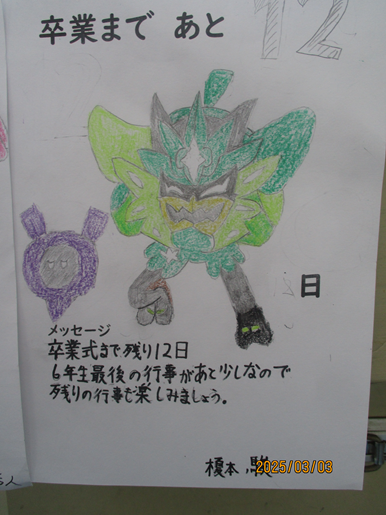 中間休み、6年生と4年生で、鬼ごっこ。中学校では、3年と1年でまた一緒になりますが、さすがに鬼ごっこはしないでしょうから、最後かな・・ 卒業式に向け、みんな、せっせせっせと作っています。 廊下の掲示も春色になってきました。 なんだか6年生が、ぐっと大人びて見えるのは私だけでしょうか。