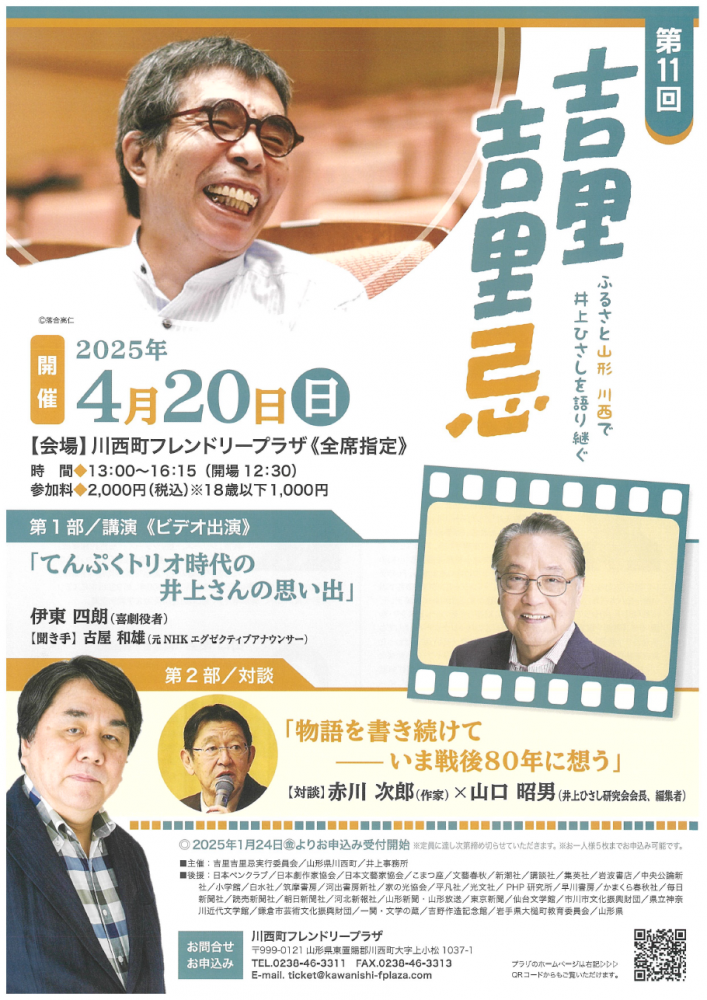 川西町フレンドリープラザにて、「第11回 吉里吉里忌」が開催されます。第1部では、喜劇役者の伊東四朗氏による講演(ビデオ出演)、第二部では、作家の赤川次郎氏と井上ひさし研究会会長の山口昭男氏による対談が行われます。この機会にぜひ、ご来場ください。<日時>令和7年4月20日(日)13:00〜16:15(12:30開場)<場所>川西町フレンドリープラザ<入場料>2,000円※18歳以下1,000円<お問い合わせ>川西町フレンドリープラザ 0238−46−3311詳細は、チラシをご覧ください。