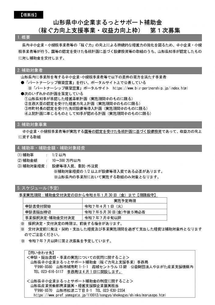 1.中小企業まるっとサポート補助金(稼ぐ力向上支援事業・収益力向上支援事業)〇補助対象:補助対象者が実施する収益力の向上に資する事業であって、経営革新計画、経営力向上計画、先端設備等導入計画、知事が認める計画に基づいて実施される設備投資○補助対象経費:設備等導入費(補助対象経費の1/2以上必須)、委託外注費※汎用機器(PC等)は原則対象外、例外的に10万円未満で必要性が明確な場合のみ可 〇〇補助率:2分の1以内〇補助金額:10万円〜300万円 2. 中小企業まるっとサポート補助金(稼ぐ力向上支援事業・DX推進枠)〇補助対象:DXの推進やデジタル技術活用による生産性向上、業務改善等の設備投資〇補助率:2分の1以内〇補助金額:10万円〜100万円 3. 中小企業まるっとサポート補助金(事業継続力強化支援事業)○補助対象:県内中小企業・小規模事業者が事業継続力強化計画またはBCPの策定に基づいて行う、防災設備等の導入に関する事業〇補助率:3分の2以内〇補助金額:10万円〜50万円 ※詳細については、山形県中小企業まるっとサポート補助金 | 山形県をご確認ください。