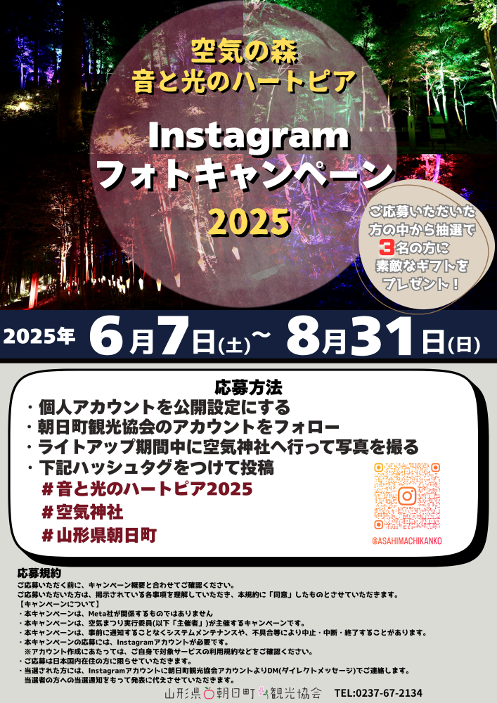 期間限定の光に包まれた空気神社。皆様からの投稿お待ちしております。【応募期間】2025年6月7日(土)〜8月31日(日)【応募方法】@個人アカウントを公開設定にした状態で、山形県朝日町観光協会の公式アカウントをフォロー朝日町観光協会のInstagramはコチラAライトアップ期間中に空気神社へ行きライトアップの写真を撮るB下記ハッシュタグをつけて投稿 #音と光のハートピア2025 #空気神社 #山形県朝日町 上記条件の上でご応募していただいた方から抽選で3名の方に素敵なギフトをプレゼント!! 【撮影についての注意点】@空気神社の神殿(ステンレス板)は、上に乗ったり物を置いたりすることを固く禁止しています。(ステンレス板は歪みやすく傷も付きやすいため)Aステンレス板の汚れ、ゴミホコリ等の掃除については傷の原因となりますので撮影者ご自身では絶対に行わないようにしてください。B危険が伴う撮影方法での作品、誤解を招く作品は応募の対象外となる場合があります。 撮影の際は周囲の状況をよく確認し、他のお客様の迷惑にならないようにご協力をお願いします。 【応募規約】ご応募いただく前に、キャンペーン概要と合わせてご確認ください。ご応募いただいた方は、掲示されている各事項を理解いただき、本規約に「同意」したものとさせていただきます。【キャンペーンについて】・本キャンペーンは、Meta社が関係するものではありません。・本キャンペーンは、空気まつり実行委員会(以下「主催者」)が主催するキャンペーンです。・本キャンペーンは、事前に通知することなく、システムメンテナンスや不具合等により中止・中断・終了することがあります。・本キャンペーンへの応募には、Instagramアカウントが必要です。 ※アカウント作成にあたっては、ご自身で対象サービスの利用規約などをご確認ください。・当選された方には、Instagramアカウントに朝日町観光協会アカウントよりDM(ダイレクトメッセージ)でご連絡します。当選者の方への当選の通知をもって発表に代えさせていただきます。【応募資格】・日本国内在住の方・この規約に同意された方・Instagramアカウントを保有し、指定アカウントをフォローされている方。※アカウントが非公開設定になっている方、投稿が検索対象外となっている方、ご応募いただいた投稿を削除された方は、応募が無効となりますのでご注意ください。※未成年の方は保護者の同意を得た上でご応募ください。※賞品発送時点まで指定アカウントをフォローしている必要があります。 【注意事項】・ハッシュタグのない投稿は無効です。・ご本人が撮影した写真が対象です。・指定のハッシュタグをつけて画像を投稿した時点で肖像権や著作権、その他一切の関連する権利(以下、「肖像権等」といいます)に対する了承がとれているものと見なします。投稿写真内で確認できる対象物によって肖像権等の第三者の権利侵害があった場合、主催者は一切責任を負いません。・指定のハッシュタグをつけて画像を投稿した時点で山形県朝日町および朝日町観光協会公式SNSやWEBサイト・動画コンテンツに画像が掲載される了承がとれているものと見なします。・本キャンペーンへの参加の際に発生したいかなる損失、負債、被害、費用、その他の申し立てについて、主催は一斉責任を負いません。・応募に関わるインターネット通信料等は応募者の負担となります。・スマートフォンの設定などについてのお問い合わせにはお答えできません。 【禁止事項】応募を通じて、以下の事項に該当するアカウントからの応募は無効とさせていただく場合があります。・Instagramの利用規約に違反している。・本キャンペーンの運営を妨げる行為。・特定の団体や個人に対する誹謗中傷。・営利を目的とした情報提供、広告宣伝もしくは勧誘行為。・公序良俗に反する行為。・その他、運営側が不適切だと判断した行為。【主催】空気まつり実行委員会