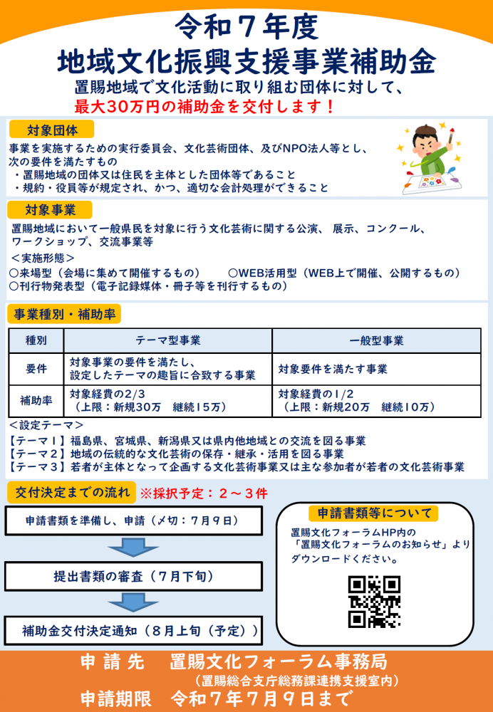 置賜文化フォーラムでは、置賜地域の皆さまが企画・運営する文化芸術事業を支援する「地域文化振興支援事業」を実施しています。このたび、令和7年度事業の二次募集を行いますのでお知らせします。■支援内容@置賜地域の文化ホールで演劇の公演をしたい!Aオンラインで置賜の伝統文化を学ぶワークショップをしたい!B会員による置賜の風景写真の作品集を発行したい! などといった事業に対し、置賜文化フォーラムが補助金を交付します。■実施形態@来場型:来場者を会場に集めて開催するものAWEB活用型:WEB上で開催・公開するものB刊行物発表型:公開や作品等を収録した電子記録媒体・冊子等を刊行するもの■申請期間令和7年6月9日(月)〜7月9日(水)・実施要綱の内容をご確認のうえ、申請書を作成し、置賜文化フォーラム事務局に提出してください。■採択予定件数2〜3件■実施要綱等・実施要綱・申請書等様式・チラシ■お問合せ・申請先置賜文化フォーラム事務局(置賜総合支庁総務課連携支援室)住所:〒992-0012 米沢市金池7丁目1番50号電話:0238-26-6021 FAX:0238-26-6022