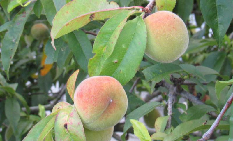 ●まだ青くて熟んでいない「モモ」が生っていました 大きさも小さく青くてまだまだ食 べられそうにありませんが朝日の照らされて少し黄色味を帯びています 梅雨があけましたが「モモ」の成熟はいつになるのでしょうか