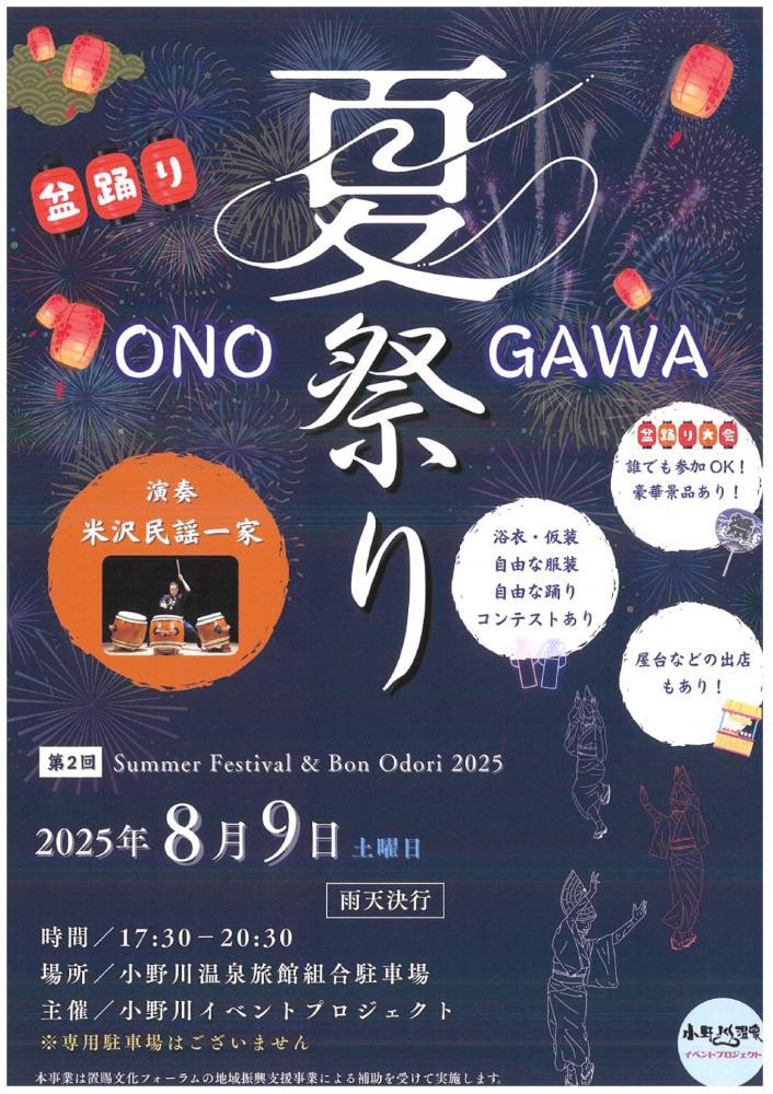 置賜総合支庁、置賜3市5町の文化行政担当部局、各市町の芸術文化協会などで組織する置賜文化フォーラムでは、置賜地域の文化振興と地域活性化を図ることを目的に、置賜地域の住民が主体となった文化事業に対し、補助金を交付しています。今年度採択された「小野川イベントプロジェクト」では、小野川温泉旅館組合駐車場にて、小野川温泉盆踊り大会を開催します。地域に古くから伝わる「小野川音頭」を米沢民謡一家が演奏します。ぜひ、ご来場ください。ぜひ、ご参加ください!<日時>令和7年8月9日(土) 17:30〜20:30 (雨天決行)<会場>小野川温泉旅館組合駐車場※専用駐車場はございません。詳細は、チラシをご覧ください。