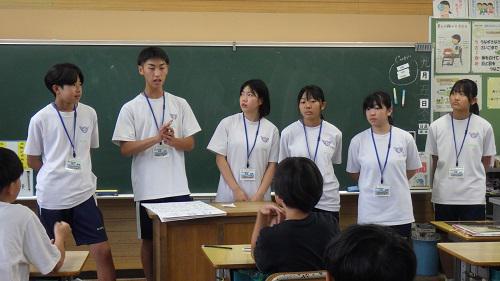 9月5日(金)、白鷹中・職場体験最終日。中学生6名は、3日から作成を進めていた資料を使いながら、6年生の子供たちに中学校での生活について説明をしてくれました。生徒会や部活、行事等のカテゴリごとに説明する中で、とても嬉しく思ったのは、6年生の子供たちの不安がなくなるように、中学校生活が楽しみになるようにと丁寧に話をしてくれたことです。 「どうすると、みんなが挨拶をしてくれますか。」という6年生の質問に、「なんで挨拶ができるようにしたいのですか。」と6年生の子供たちに質問を返し、「挨拶をしたとき挨拶が返ってこないと、悲しくなりますよね。挨拶を返してもらうと嬉しくなるし気持ちが伝わった感じがすると思うんです。人の心を温かくするから、だから挨拶は大事だとみんなにわかってもらうことも大切だと思います。」こんな風に教えてくれました。先輩達からの言葉だからこそ、6年生の子供たちの心にしみたようです。 6名の中学生の皆さん、素敵な時間をありがとうございました。 6年生の子供たちの真剣な眼差し・・・。 中学生の自学ノートの美しさにびっくり!