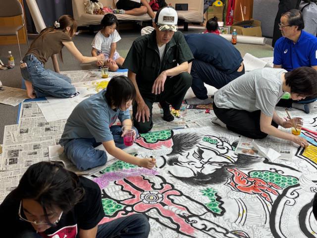 体育推進会役員有志と中学生有志、子どもたちが参加してねぷた絵の色入れを行いました。9月20日(土)に展示作業、点灯式を行います。午後6時ちょい前の点灯カウントダウンの掛け声を一緒にしてくれるお友達を募集。小さなお子様にはお菓子をプレゼントします!(午後5時55分までに正面玄関前に来てね!)