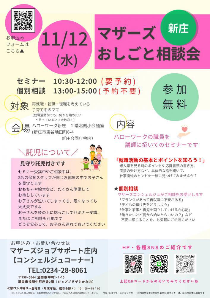 マザーズジョブサポート庄内おしごと相談会 in 新庄を開催します。【開催日】11月12日(水)【開催場所】ハローワーク新庄2階北側小会議室(新庄市東谷地田町6-4   新庄合同庁舎内) 【内容】第1部 10:30〜12:00「就職活動の基本とポイントを知ろう!」(要予約)求人票を見るときのポイントや応募書類の書き方、面接の受け方など具体的な話を聞いて、仕事復帰のヒントを一緒に見つけてみませんか?第2部 13:00〜15:00 個別相談会  (予約不要)・おしごとに関するお悩み・子どもの預け先・仕事と家事、子育てとの両立      など、お気軽にご相談ください。※どなたでもご利用いただけます、 ♪お子さんと一緒に、お気軽にお越しください♪お子さんと同じお部屋でセミナーを受講し、相談することができます。保育スタッフが、ママをサポートいたします。 どうぞ、お気軽にお問い合わせくださいね。☆★☆コンシェルジュコーナーでLINEアカウントやっております♪              ☆★☆セミナーのお知らせや、お問い合わせ、お申込みにも対応しています♪ぜひお友達になってください☆https://lin.ee/zBnhdYULINEの場合は「お名前、電話番号、申込み講座、託児の有無」を送信して返信をお待ちくださいマザーズジョブサポート庄内コンシェルジュコーナーからの返信をもって申込受付完了となります◇お申込み・お問い合わせ◇マザーズジョブサポート庄内TEL:0234-28-8061