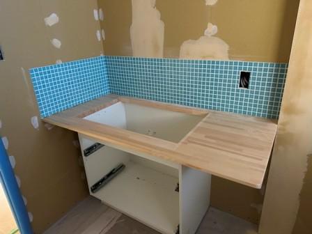 こんにちは。 新築工事の現場で造作洗面台を施工中です。洗面化粧台のユニットを設置する場合が多いですが、造作の洗面台もポイントでいい雰囲気が出ます。 モザイクタイルが貼り終わり、これからクロスを仕上げていきます。カガミ、収納、洗面ボウルを設置して完成になります。 by-j.saito