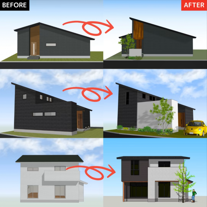先日、まるごとマラソンに出てからまだ体調の方が回復しないこの頃です。年齢と共に体力が衰えてきているのと同時に、練習不足も影響があると実感した所です。  本日は、デザインとして関心がある部分を記載したいと思います。最近は外観が気になってきて、SNS等で見ていた所デザインがどのようにすればオシャレな見方になるか考えていました。このように同じ間取りでも色のアクセントを出すことでイメージががらりとかわるなと感じます。サッシ枠の色や外壁、窓と色々な要素がありますが、屋根のカタチは大きなデザイン要素になっていますね。 こちらは先日訪れた飲食店の内装で和風のオシャレなデザイン空間でした。欄間をうまく使って照明とデザイン性を向上させる使い方をしているなと関心してきました。 また、木目調のデザイン集として一部切り取りしましたが、無垢材や木目調家具、植栽などで間接照明を融合して陰影をつくることでデザイン性を向上させているなと思います。 外観が太陽光発電を2棟連続して設定していますが、やはりデザインを考えると統一感が感じられますので、街並みを整える上では外観や仕上げを共通する協定みたいのがあると整うなと実感した所でした。
