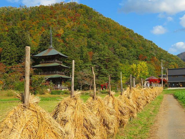 安久津八幡神社三重塔前には、稲杭がずらりと並んでいます。刈り取った稲束を杭に掛けて自然乾燥する「稲杭い立て」は、杭を1本1本田んぼに打ち込み、掛けた稲束がずり落ちないように、横木を紐でくくり付けています。いずれも手作業で、大変根気のいる作業です。風情ある風景は、懐かしい郷愁を誘いますね(^^)三重塔付近の木々山々も、少しずつ紅葉が始まって来ました。今年も、色鮮やかな景色を見せてくれると思います。あと少しお待ちくださいね♪