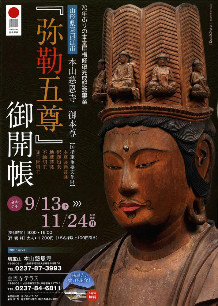 山形県寒河江市に佇む古刹、本山慈恩寺(ほんざんじおんじ)。奈良時代に開かれたと伝わるこの歴史深き寺院で、2025年9月13日(土)〜 11月24日(月・祝)まで、70年ぶりの本堂屋根修復完成を記念した大変貴重な「弥勒五尊(みろくごそん)」の御開帳が開催されています。普段は固く閉ざされている秘仏の扉が開き、国指定重要文化財の荘厳な姿を間近で拝むことができる、またとない機会です。 弥勒五尊 御開帳 イベント概要 開催期間2025年 9月13日(土) 〜 11月24日(月・祝) 受付時間9:00 〜 16:00 場所瑞宝山 本山慈恩寺 (山形県寒河江市大字慈恩寺地籍31) 特別拝観料大人: 1,200円 (15名様以上100円引)高校・大学生: 800円小・中学生: 500円 お問い合わせ本山慈恩寺: 0237-87-3993慈恩寺テラス: 0237-84-6811 御開帳の3つの見どころポイント 170年の時を経て蘇った本堂と秘仏の荘厳な空間今回の御開帳は、約70年ぶりに行われた本堂の茅葺屋根修復工事の完成を記念するものです。美しく生まれ変わった本堂の荘厳な佇まいは圧巻の一言。その神聖な空間で、11年ぶりに公開される秘仏「弥勒五尊」と対面する時間は、忘れられない体験となるでしょう。ポイント 2「弥勒五尊」の圧倒的な存在感御本尊である「弥勒菩薩坐像」を中心に、四体を配した五尊形式は、国内に他の例を見ない大変貴重なものとされています。平安・鎌倉時代の傑作といわれる仏像群が放つ静謐で力強いオーラは、見る者の心を深く揺さぶります。一木造りの素朴ながらも精緻な彫刻美を、ぜひその目でご覧ください。ポイント 3歴史の息吹を感じる国史跡「慈恩寺旧境内」を散策慈恩寺は、その広大な旧境内が国の史跡に指定されています。本堂のほかにも、山形県指定文化財の三重塔や山門など、歴史的な建造物が点在しており、見どころ満載です。御開帳とあわせて境内をゆっくりと散策し、東北随一と謳われた往時の隆盛に思いを馳せてみてはいかがでしょうか。 交通アクセス・駐車場 お車をご利用の場合・山形自動車道 寒河江ICより車で約15分・山形空港より車で約25分【駐車場】第1駐車場・第2駐車場など、無料駐車場が完備されています。詳細は現地の案内に従ってください。 公共交通機関をご利用の場合・JR左沢線「羽前高松駅」より徒歩約30分 Googleマップで場所を確認する あわせて立ち寄りたい!「慈恩寺テラス」慈恩寺のすぐそばにある「慈恩寺テラス」は、国史跡・慈恩寺の歴史や文化を楽しく学べるガイダンス施設です。大型シアターやプロジェクションマッピングなど、最新技術を駆使した展示で慈恩寺の魅力を深く知ることができます。嬉しい入館無料で、地元食材を使ったグルメが味わえるカフェも併設。拝観の前後に立ち寄れば、慈恩寺の旅がより一層充実すること間違いなしです。 よくある質問 (FAQ)Q. 御開帳限定の御朱印はありますか? A. 御開帳を記念した特別な御朱印がございます。Q. 拝観の所要時間はどのくらいですか? A. 御本尊の拝観だけでなく、広大な境内や他の文化財も見学することをおすすめしますので、約60分のお時間をみておくと、ゆっくりと堪能できます。Q. 撮影は可能ですか? A. 本堂内や仏像など、貴重な文化財は撮影が禁止されております。現地の案内に従ってマナーを守って拝観しましょう。まとめ70年ぶりの本堂修復という大きな節目に立ち会える、本山慈恩寺の「弥勒五尊 御開帳」。歴史と文化、そして人々の祈りが紡いできた貴重な秘仏との出会いは、きっとあなたの心に深く刻まれるはずです。この秋はぜひ寒河江市を訪れ、悠久の時に触れる感動の旅をご体験ください。body{font-family: 'Noto Sans JP', sans-serif;}details > summary {list-style: none;}details > summary::-webkit-details-marker {display: none;}details[open] summary .fa-chevron-down {transform: rotate(180deg);} {"@context":"https://schema.org","@graph":[{"@type":"Event","name":"本山慈恩寺 御本尊「弥勒五尊」御開帳","startDate":"2025-09-13T09:00","endDate":"2025-11-24T16:00","eventAttendanceMode":"https://schema.org/OfflineEventAttendanceMode","eventStatus":"https://schema.org/EventScheduled","location":{"@type":"Place","name":"瑞宝山 本山慈恩寺","address":{"@type":"PostalAddress","streetAddress":"大字慈恩寺地籍31","addressLocality":"寒河江市","addressRegion":"山形県","postalCode":"990-0511","addressCountry":"JP"}},"image":["https://yamagata-kouiki.info/images/jionji-gokait-poster.jpg"],"description":"70年ぶりの本堂屋根修復完成を記念して、国指定重要文化財である御本尊「弥勒五尊」を特別に御開帳します。平安・鎌倉時代の傑作といわれる貴重な仏像群を間近で拝観できるまたとない機会です。","offers":{"@type":"Offer","url":"https://yamagata-kouiki.info/event-jionji-gokaicho/","price":"1200","priceCurrency":"JPY","availability":"https://schema.org/InStock","validFrom":"2025-09-13","validThrough":"2025-11-24"},"organizer":{"@type":"Organization","name":"瑞宝山 本山慈恩寺","url":"http://www.honzan-jionji.jp/"}},{"@type":"Article","mainEntityOfPage":{"@type":"WebPage","@id":"https://yamagata-kouiki.info/event-jionji-gokaicho/"},"headline":"【70年ぶり】本山慈恩寺「弥勒五尊」御開帳2025|国重文の秘仏に会える