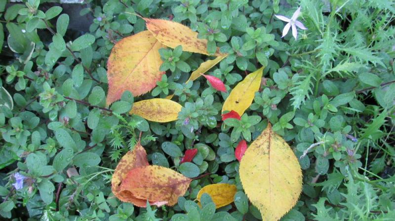 ●朝から冷たい雨が降っています 10度を下まわるような寒さの日もあり周りの木々も色づいてきました 庭の藤や桜の葉が黄色になりドウタンがようやく紅くなり始めました 緑色のプランターの草花に落ちた黄色と紅の葉が秋を感じさせてくれています 植物の葉が紅葉するのは気温が低くなって光合成の効率が落ちることから起こる現象だそうです