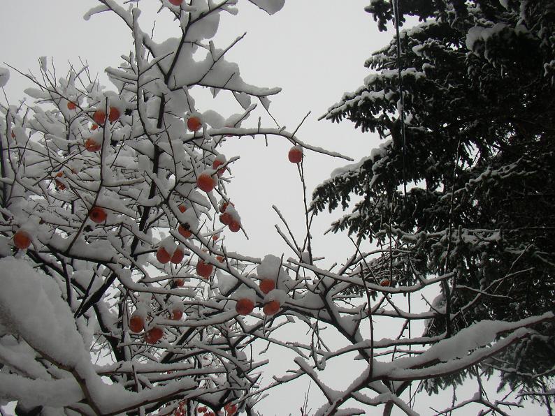 雪をかぶった柿の実がぶら下がっている。