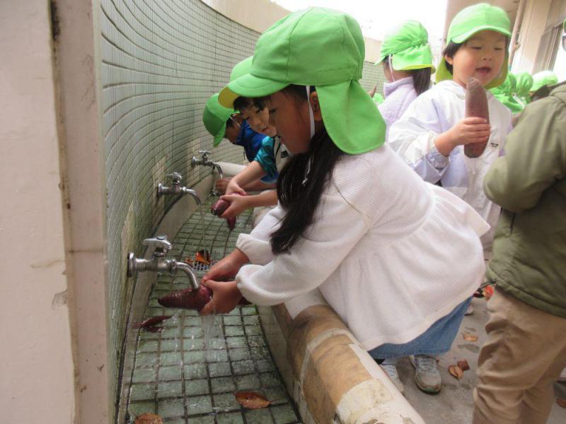園の畑でサツマイモがたくさん収穫できたため、やきいもをしました。年長児さんに教えてもらいながらサツマイモをきれいに洗って、新聞紙やアルミホイルで包みます。煙が上がると「くさい」「けむい〜」と大騒ぎです。ほかほかやきいもに「もっとたべたい」とおかわりを催促してみんなで食べました。