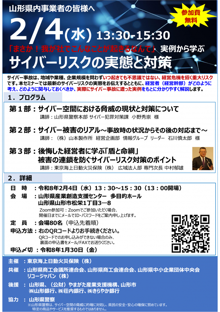 山形県内事業者を対象に、サイバーリスク対策セミナーを開催します。2月4日(水)13:30〜15:30、山形県産業創造支援センターにて、会場参加80名・Zoom参加も可能です。山形県警察本部による最新の脅威解説、実際にサイバー被害に遭った企業の生々しい体験談、そして東京海上日動による実践的な対策ポイントを3部構成で学べます。「まさか我が社で」と思っている経営者こそ必見。地域・業種・規模を問わず、今やサイバー事故は経営危機に直結する重大リスクです。参加費無料。申込締切は1月30日(金)。中山町商工会会員の皆様もぜひご参加ください。申込書は、↑PDFチラシの裏面となっております。