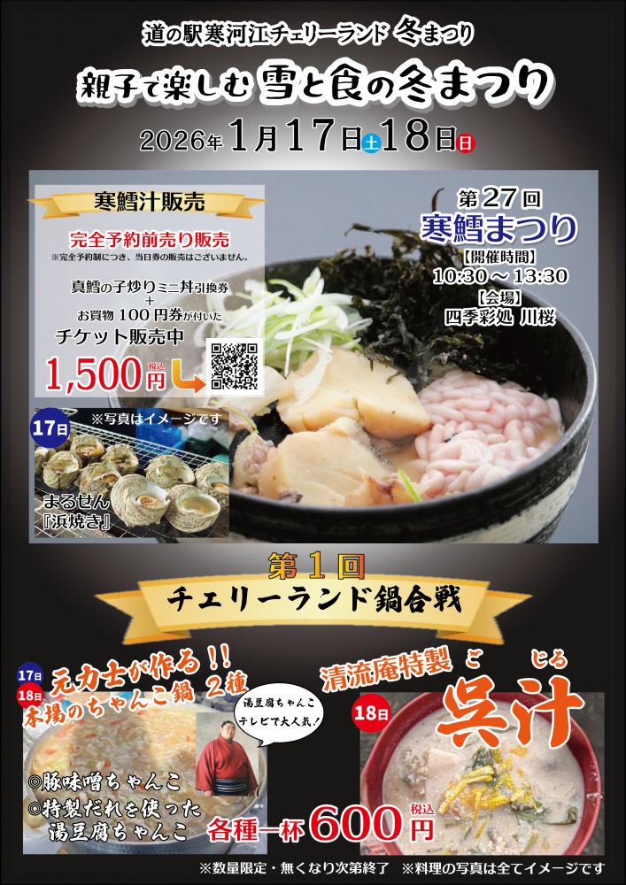道の駅寒河江チェリーランド雪と食の  冬まつり2026  1月17日(土)・18日(日) 寒河江の冬はワクワクがいっぱい! 真っ白な雪で遊んで、あったかい鍋を食べて、甘〜いイチゴに、にっこり笑顔♪一日中遊べるイベントが盛りだくさん!  第27回 寒鱈まつり  1/8(木) からチケット販売開始!  完全予約前売り販売制当日のチケット販売はありません。   料金: 1,500円(税込)   会場: 四季彩処 川桜   時間: 10:30 〜 13:30セット内容・寒鱈汁 ・真鱈の子炒りミニ丼引換券  ・お買物100円券公式サイトでチケットを確認     あったか〜い!鍋合戦17日(土)・18日(日)元力士の本格ちゃんこ鍋「豚味噌ちゃんこ」と特製だれを使った「湯豆腐ちゃんこ」が登場!力士直伝の味でパワーチャージ!各 一杯 600円(税込)18日(日) 限定!清流庵特製 呉汁(ごじる)大豆の風味がたまらない郷土の味。濃厚な一杯をどうぞ。一杯 600円(税込)  雪あそび ・ ライブ  雪あそびコーナーチューブ・そり の無料貸出あり!雪だるまを作ったり、雪遊びを思いっきり遊ぼう!  しおたん&syugo LIVE17日(土) 14:00テレビ番組「歌唱王2024」優勝のしおたん が凱旋!心震える歌声をお届け。  キャラクター集合17日(土)のみチェリンをはじめ、かわいいご当地キャラたちが会場に遊びに来るよ♪  いちご&限定グルメ  矢板市産「とちあいか」大特売会17日(土) 9:00〜限定200パック!早いもの勝ち 連携協定を結ぶ「道の駅やいた」から直送!甘〜いイチゴをお土産にいかが?   冬のホットドリンク 地元フルーツのホットワイン、甘酒、ホットジュースで温まろう。   メガ盛りメニュー! 全てのせトッピング×麺2玉分のスペシャルそば・うどん一杯1,300円(先着20名 )や さくらんぼ ジャンボパフェ5,000円(限定10食)が登場!   アクセス   日時: 2026年1月17日(土)・18日(日)   問合せ: 0237-86-3111 (チェリーランドさがえ)  道の駅 寒河江 チェリーランド { "@context": "https://schema.org", "@graph": [ { "@type": "Event", "name": "道の駅寒河江チェリーランド 冬まつり2026", "startDate": "2026-01-17", "endDate": "2026-01-18", "eventStatus": "https://schema.org/EventScheduled", "eventAttendanceMode": "https://schema.org/OfflineEventAttendanceMode", "location": { "@type": "Place", "name": "道の駅寒河江チェリーランド", "address": { "@type": "PostalAddress", "streetAddress": "大字八鍬字川原919-8", "addressLocality": "寒河江市", "addressRegion": "山形県", "postalCode": "990-0523", "addressCountry": "JP" } }, "image": [ "https://yamagata-kouiki.info/assets/images/event/cherryland_winter2026.jpg" ], "description": "親子で楽しむ雪と食の冬まつり。寒鱈まつり、鍋合戦、雪遊び、いちご特売、しおたんスペシャルライブなど開催。", "performer": { "@type": "Person", "name": "しおたん" }, "organizer": { "@type": "Organization", "name": "チェリーランドさがえ", "url": "https://www.cherryland.co.jp/" } }, { "@type": "FAQPage", "mainEntity": [ { "@type": "Question", "name": "寒鱈まつりのチケットは当日買えますか?", "acceptedAnswer": { "@type": "Answer", "text": "いいえ、寒鱈汁販売は「完全予約前売り販売」となっており、当日の販売はありません。2026年1月8日(木)より販売開始される前売りチケットをお買い求めください。" } }, { "@type": "Question", "name": "雪遊びコーナーは有料ですか?", "acceptedAnswer": { "@type": "Answer", "text": "いいえ、チューブやそりの貸出は無料です。雪だるまづくり体験なども楽しめます。" } } ] } ]}