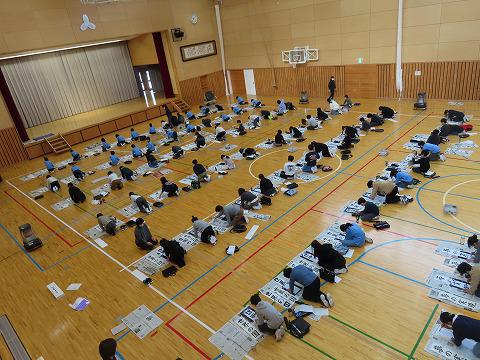 今日の2時間目に全校生で書き初め大会を行いました。3〜6年生は毛筆を使い体育館で。1・2年生は鉛筆書きを教室で行いました。一人一人が集中して作品を仕上げていました。最後、汚れたところを拭いている5・6年生がいました。第一小学校では、こういう姿をめざしています。できた作品は掲示し、金賞を各学年約2割で表彰する予定です。